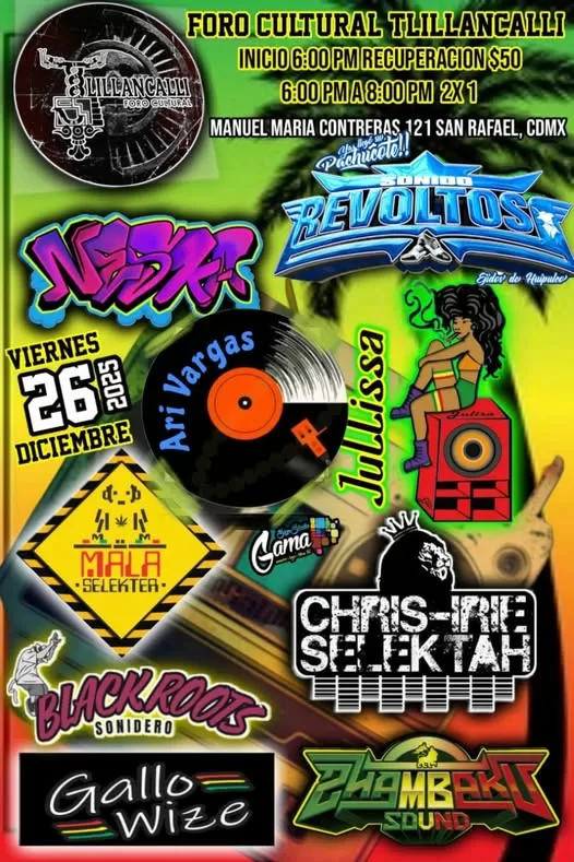 Este viernes 26 los esperamos para disfrutar de una buena sesión tropical a cargo de un gran elenco Neska Selectress Arizbeth Vargas Jonazham Zham Gallo Wise Chris-Irie Selektah Julissa R Ellis @Black Roots @Sonido revoltoso @Gama Navegación de entradas Cultural Roots presenta: 45 Aniversario de Channel One Sound SystemMiércoles 10 de Diciembre 2025